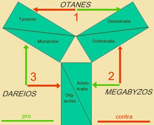 SituationAls Großkönig Kambyses auf seinem Feldzug in Ägypten abwesend war, nutzten zwei Mitglieder der Priesterkaste der Mager die Gelegenheit: Nachdem sie Smerdis, den Bruder des Kambyses beseitigt hatten, setzte sich einer von ihnen, der Smerdis ähnlich sah, auf den persischen Thron und regierte als "Falscher Smerdis". Im Jahre 522 v. Chr. entthronte Dareios diesen "Falschen Smerdis" mit sechs weiteren Mitverschwörern aus dem persischen Adel. Das so entstandene Machtvakuum eröffnet die Fiktion der "Stunde Null": Scheinbar voraussetzungslos ("utopisch") kann man diskutieren, welche Regierungsform man etablieren sollte. Die Stunde der Theoretiker oder zumindest der theoretisierenden Pragmatiker hat geschlagen. So hat es den Anschein, wenn man sich dazu verführen lässt, die Debatte inhaltlich und formal als einen in sich geschlossenen Textabschnitt aus ihrem Zusammenhang herauszulösen. Der Charakter des lockeren Einschubes lässt sich sicher nicht hinweg diskutieren, doch muss man auch seine Funktion im Erzählzusammenhang bedenken. Ein neues Großthema hat begonnen: Die Darstellung der Regierung des Kambyses (II 1 - III 60) ist abgeschlossen; es folgt die Regierung des Dareios (III 61 - VII 4). Funktional geht es also darum, an der Art, wie er die Macht an sich gebracht hat, ein Charakterbild zu entwerfen: Er ist der raffinierte und gewiefte Taktiker und Pragmatiker, der es versteht, eine historische Gelegenheit beim Schopf zu ergreifen und bedenkenlos für seine Zwecke auszunutzen. Teilnehmer an der Debatte waren die sieben Befreier. Beiträge liefern (entsprechend der Dreizahl der gewürdigten Staatsformen):