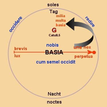 - "occidere, redire, lux, nox,...", ebenso die Vorstellung von Entstehen (Aufgang, Geburt), Vergehen (Untergang, Tod), Dauer (Tageszeit, Lebenszeit), Wiederkehrende Wiederholung (Sonnen, Küsse) lassen sich sowohl dem Natur- als auch dem menschlichen Bereich zuordnen, so dass ein "poetischer Identifikationsakt" stattfindet, der die Entsprechung sowohl in ihrer Parallelität als auch Gegensätzlichkeit "evident" erscheinen lässt (vgl. W.Killy, Elemente, S.21f.)
