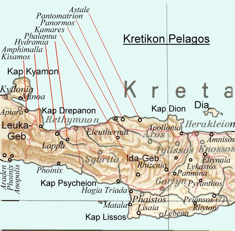 Mittelteil von Kreta: Amnisos | Amphimalla | Anopolis | Apollonia | Aptara | Araden | Astale | Axos | Dia (ins) | Dion (Kap) | Drepanon (Kap) | Eleuthernai | Eltynaia | Gortyn | Hagia Triada | Herakleion | Hydramia | Ida (m) | Kamares | Kisamos | Knossos | Kydonia | Lappa | Lebena | Leuka (m) | Lisaia | Lissos (Kap) | Lykastos | Matala | Minoa (Kreta) | Pannona | Panormos | Pantomatrion | Phaistos | Priansos | Kyamon (Kap) | Rethymnon | Rhizenia | Rhyton |Sybritta | Tylissos |